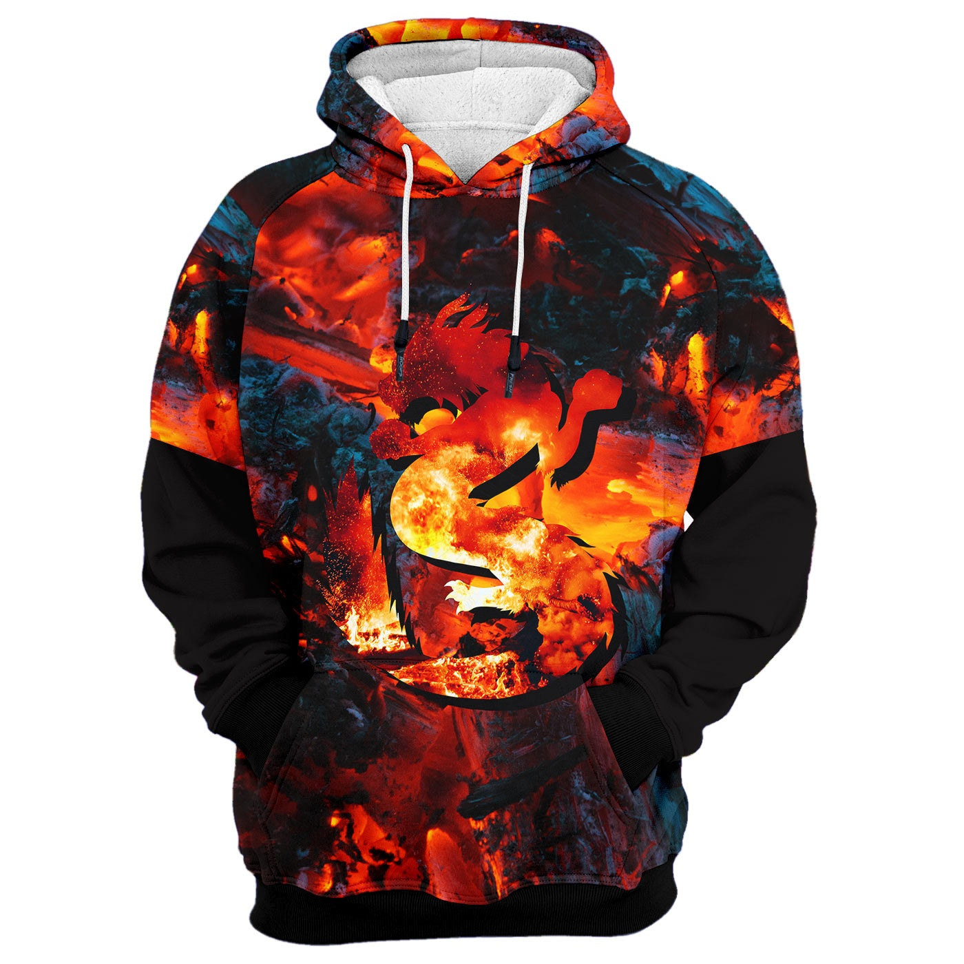 Wear our one of a kind After The Fire Hoodie featuring custom made design, crafted from 100% polyester. The smoldering background with the dragon silhouette was designed by our resident artists.
