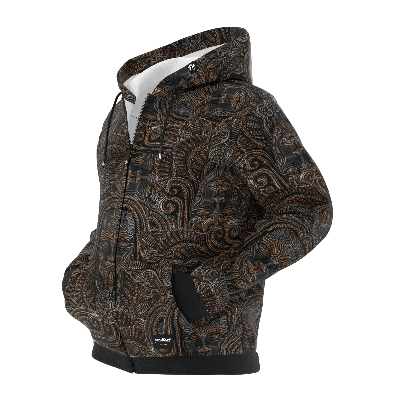 Introducing the Ancient Totem Zip Up Hoodie – a wearable work of art that pays homage to the ancient traditions of wooden totem carving. This is a testament to craftsmanship and cultural heritage, featuring an all-over design crafted from intricate wooden totem patterns.