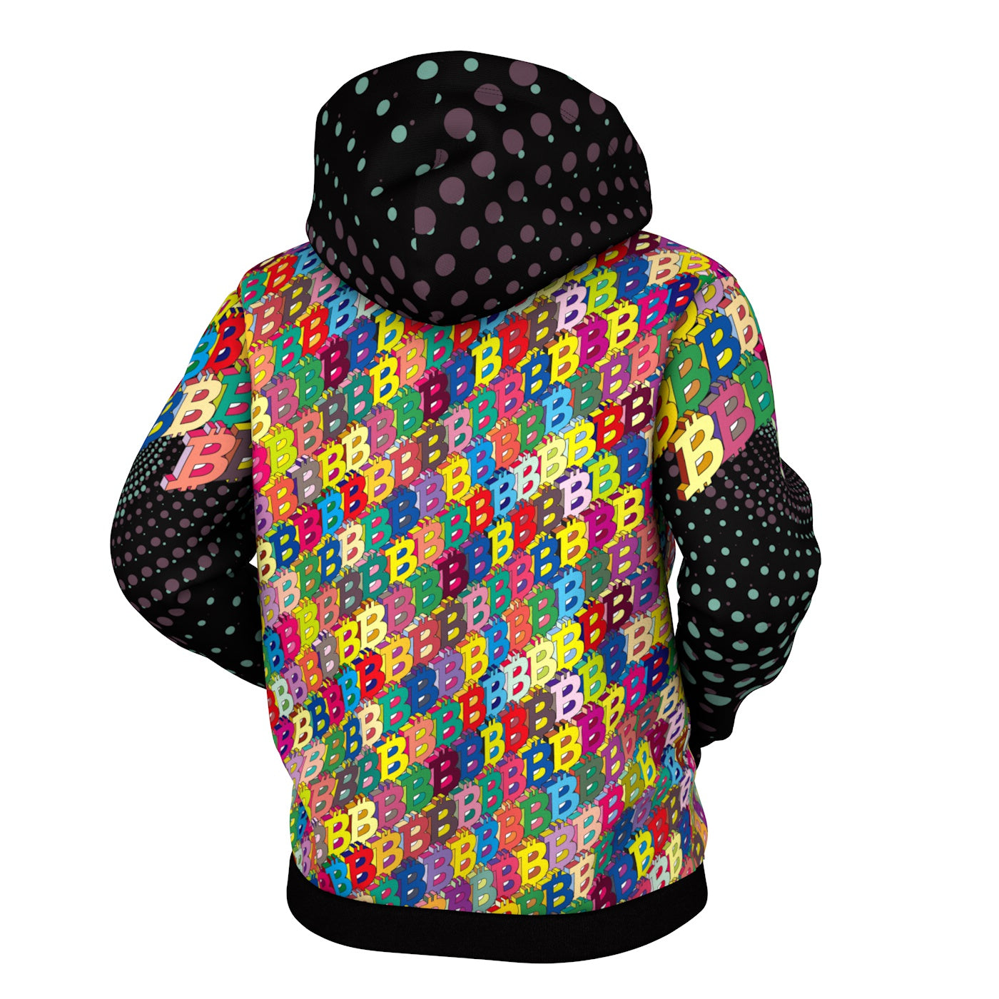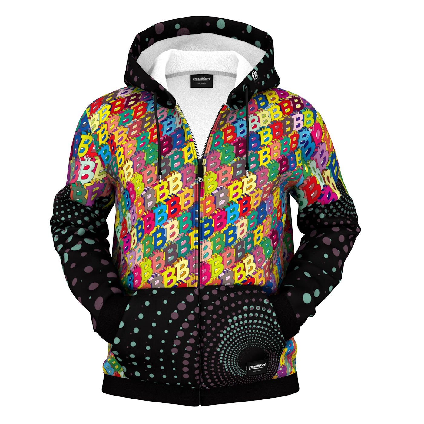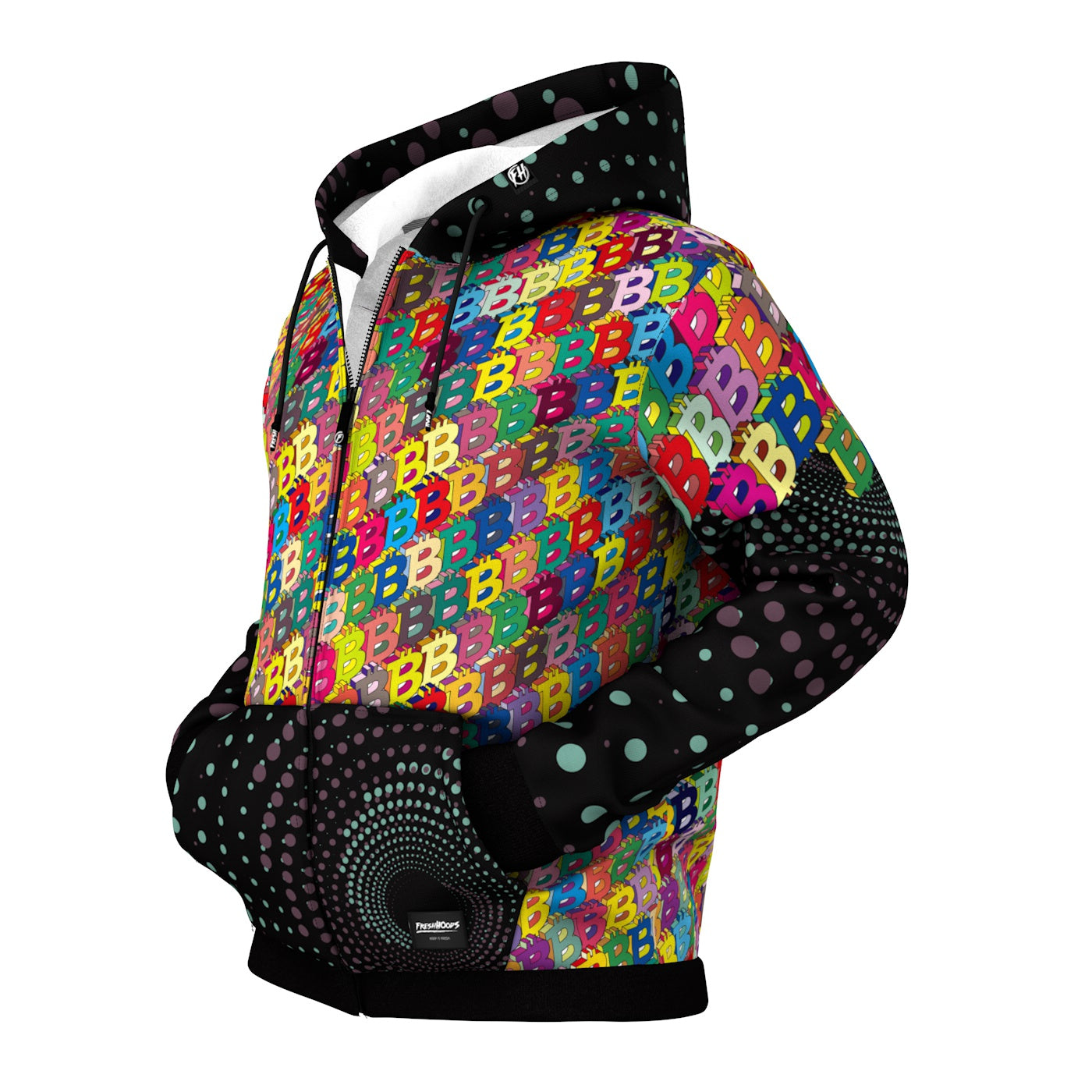 Drop some color into your digital life with the BBB Zip Up Hoodie, featuring a custom-made design, crafted from 100% polyester. Our team of talented graphic artists created this striking virtual money pop-art pattern.