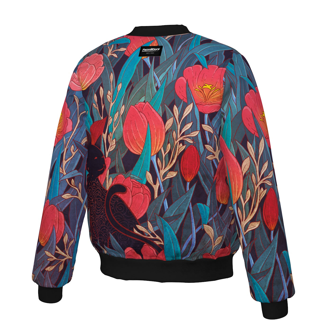 Keep your outerwear vivacious with the Black Cat Tulips Bomber Jacket, handcrafted for fully aligned edge-to-edge graphics. Our resident artists created these deep-colored flowers with a cat graphic in collaboration with the talented designer Roberto Nieto, aka Syntetyc. Creating some eye-catching contrast that'll make you purr.