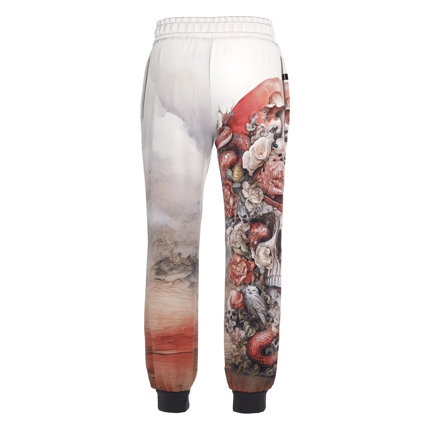 Introducing the Bloom of Mortality Sweatpants, a mesmerizing creation by the visionary designer Riza Peker. This garment is a wearable masterpiece, featuring a striking design of a skull intricately adorned with enchanting flowers and mushrooms. As you delve into the ethereal design, discover hidden elements—a symphony of owls and snakes woven seamlessly into the fabric, adding an extra layer of mystique.