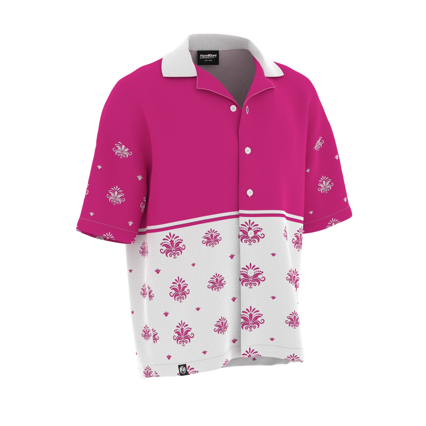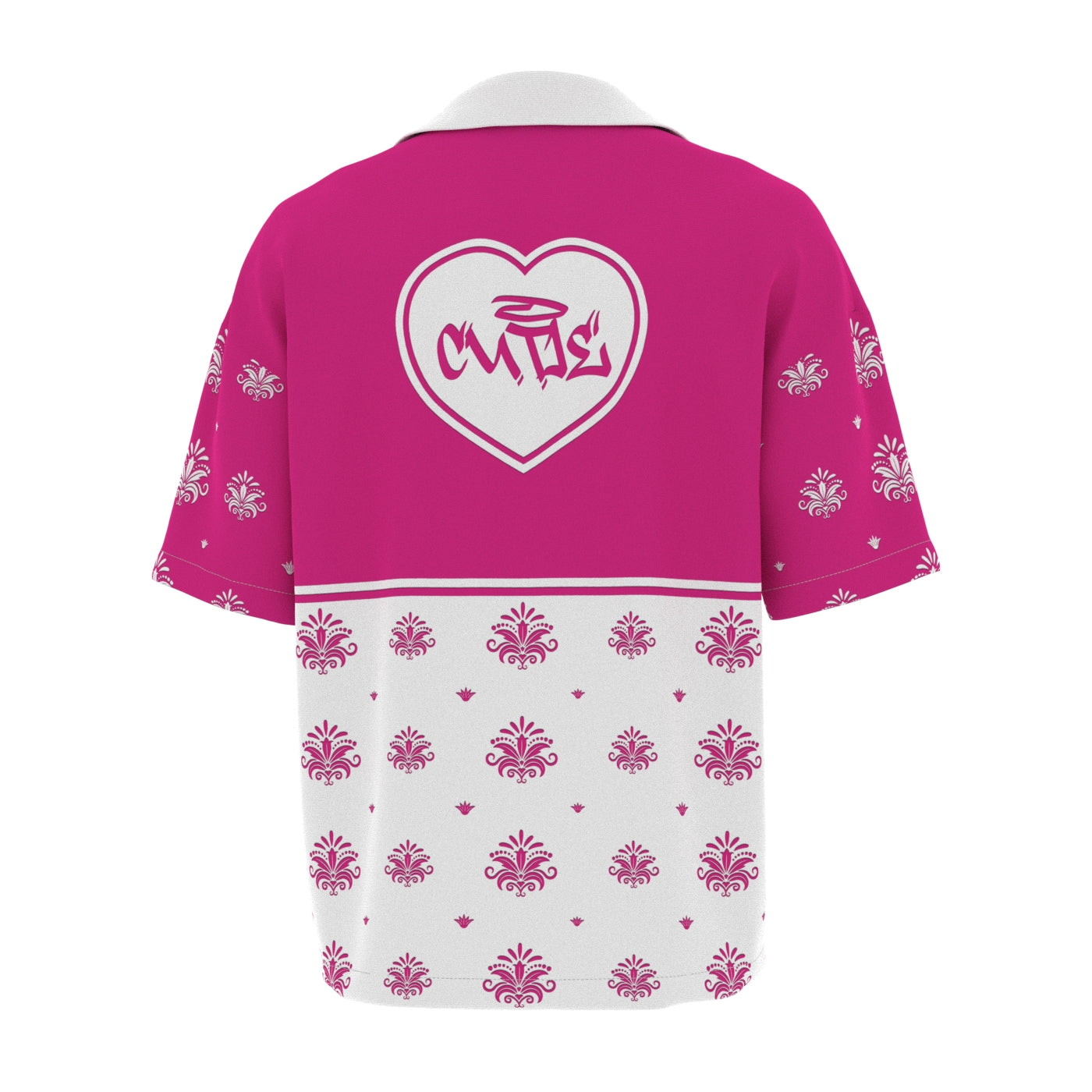 Introducing the Cutie Oversized Button Shirt - a quirky mashup of cute and ornate! The top half is pretty in pink, like a fluffy cotton candy cloud. Below, enjoy ornate pink prints on a white background for a touch of vintage charm. But the real showstopper is on the back - the word "Cutie" inside a heart will have everyone swooning. Be a walking contradiction of sweet and sophisticated with this charming shirt that spreads smiles wherever you go!