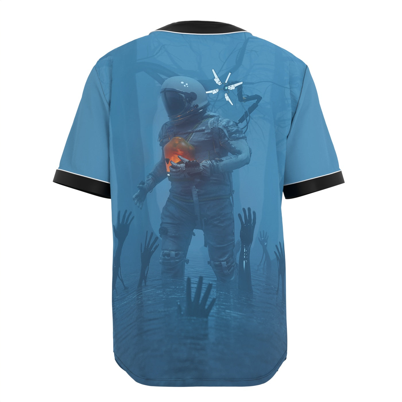 Dive into the Unknown with the Deep Blue Jersey crafted by the talented designer KAMUI. Picture an astronaut bravely navigating through a mysterious dark woods, as if strolling across the surface of a serene lake. The scene unfolds with haunting beauty, featuring hands reaching out from the water, creating an otherworldly ambiance. The entire composition is immersed in a captivating blueish hue, evoking a sense of mystery and wonder. Elevate your wardrobe with this captivating piece that seamlessly blends the celestial and the surreal.