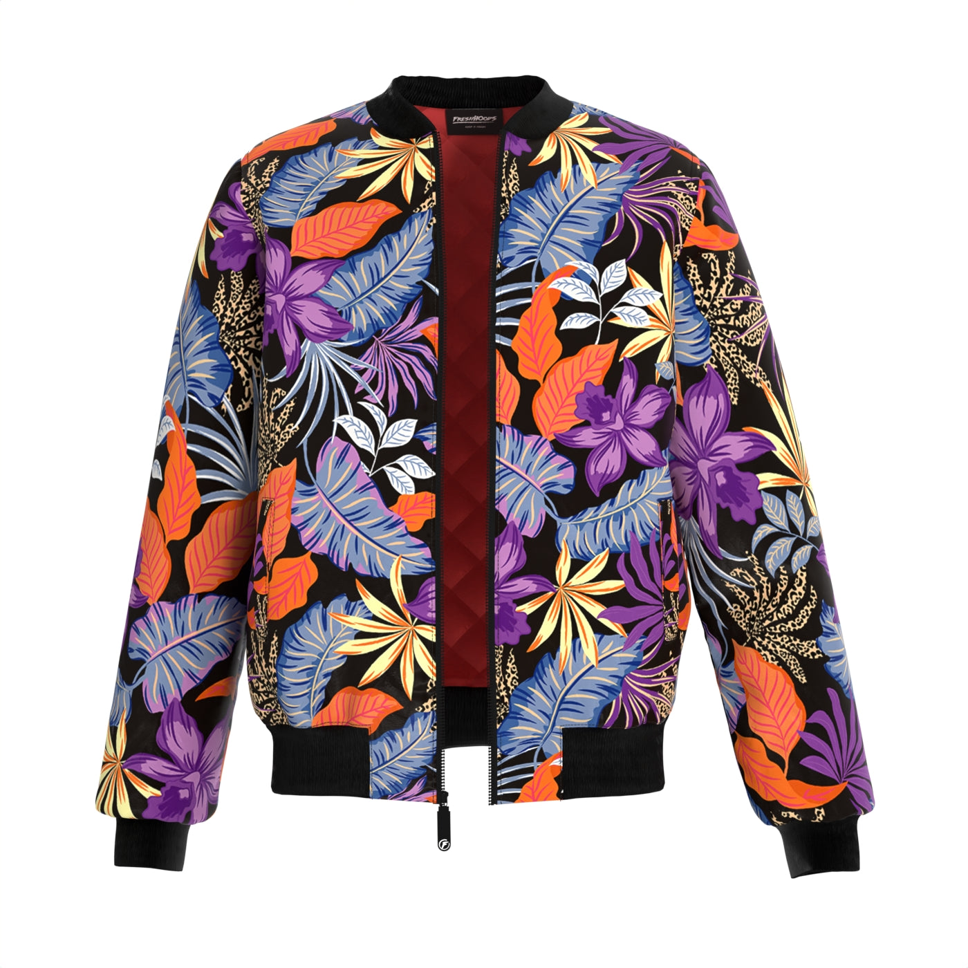 Find out the secret life of flowers with the Evening Floral Dance Bomber Jacket, handcrafted aligned for fully edge-to-edge graphics. Our team of resident artists created this flowery garden scene at night for an exotic look.