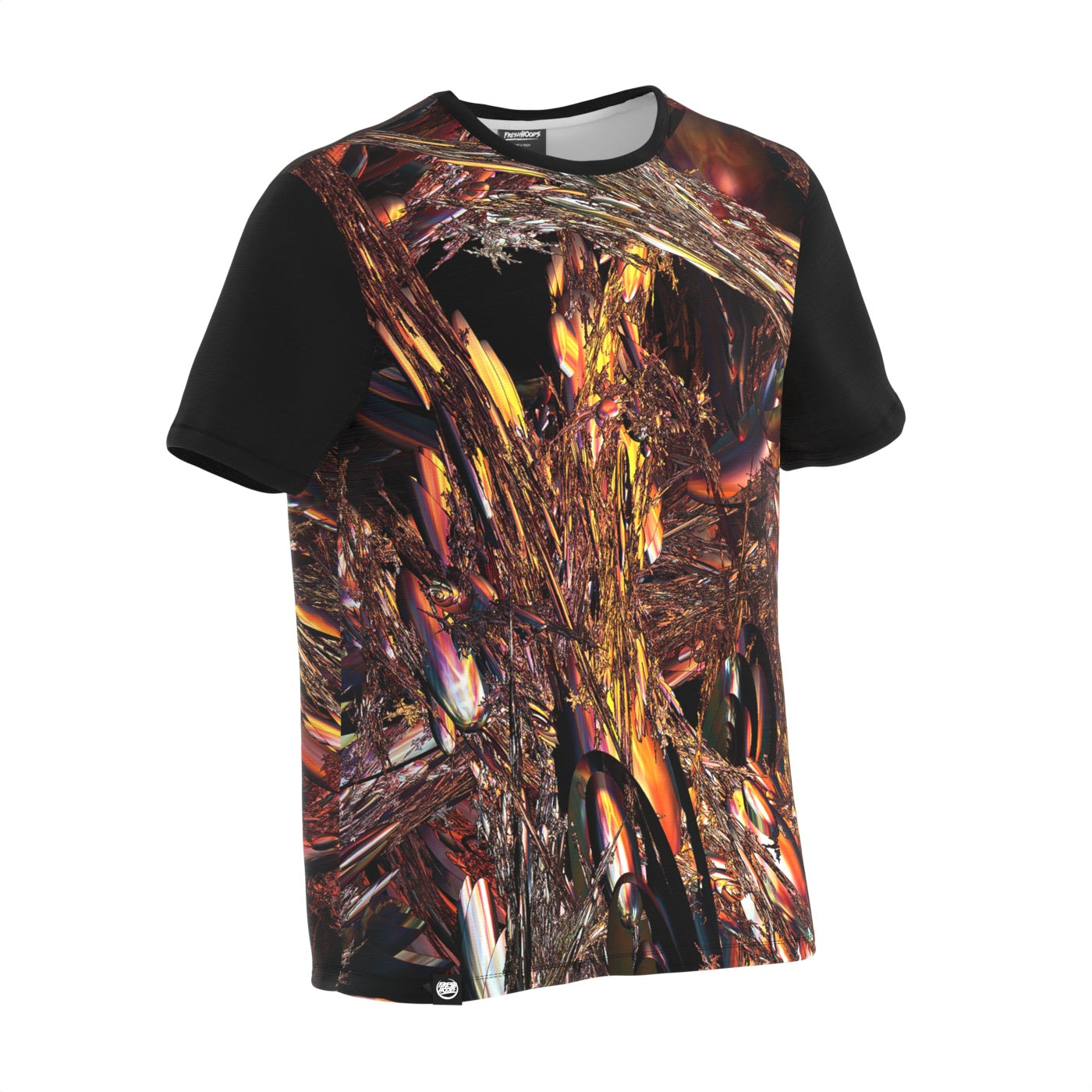 Introducing the Fibriconics T-Shirt, a mesmerizing creation by the visionary designer Casey Haha. This avant-garde piece is a testament to the intersection of art and fashion, resembling a metallic junkyard bathed in the warm hues of a captivating sunset.
