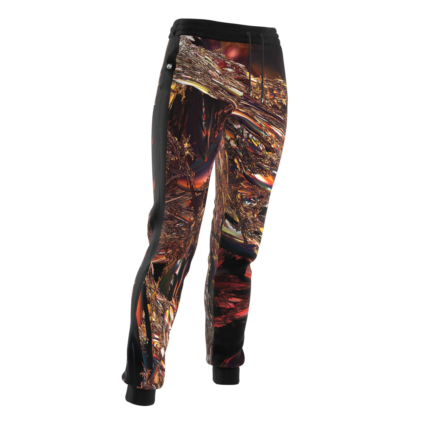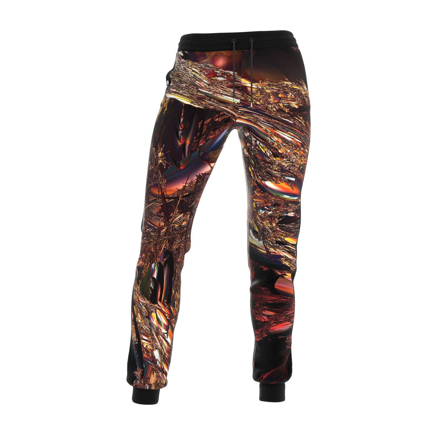 Introducing the Fibriconics Women Sweatpants, a mesmerizing creation by the visionary designer Casey Haha. This avant-garde piece is a testament to the intersection of art and fashion, resembling a metallic junkyard bathed in the warm hues of a captivating sunset.