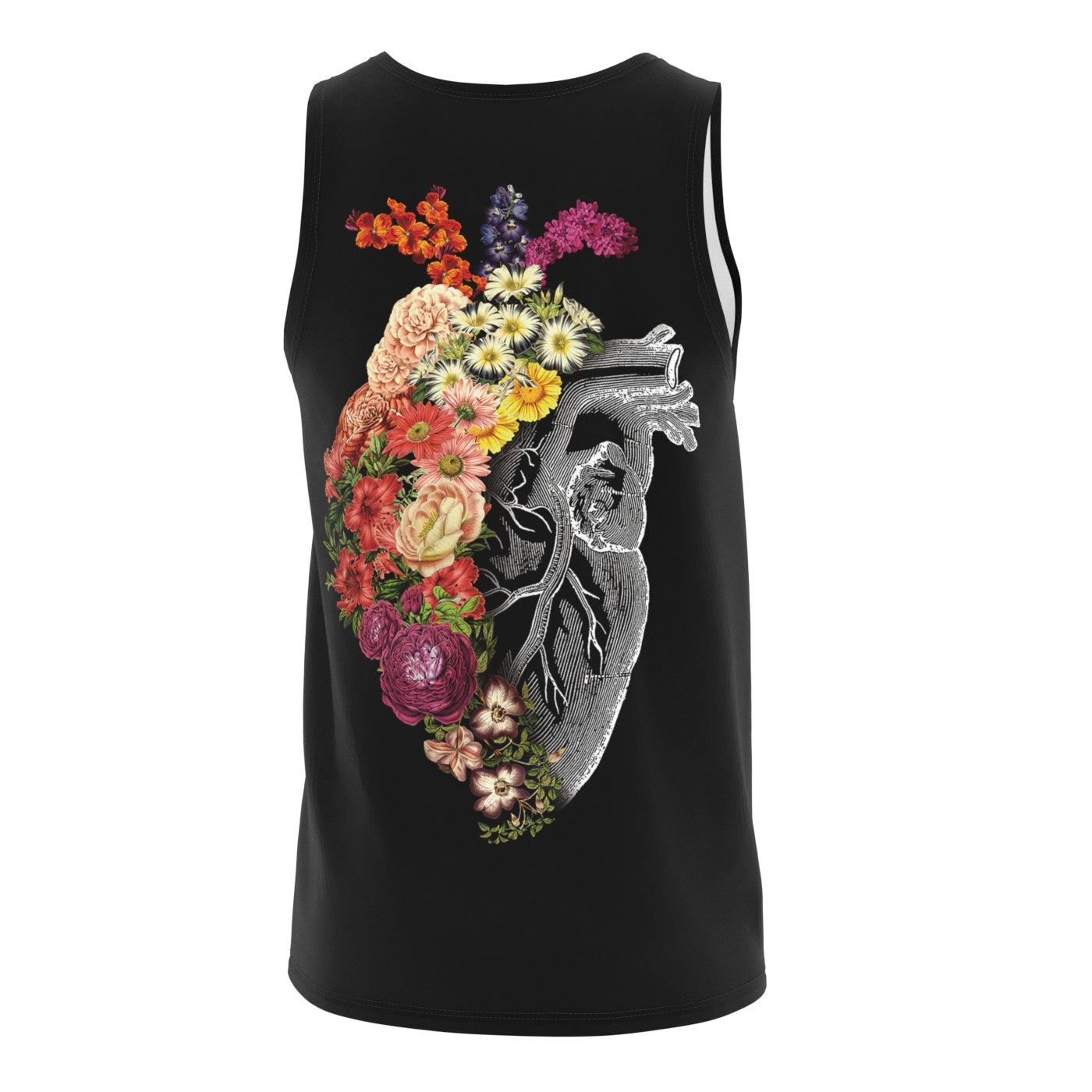 Introducing the Flower Heart Tank Top, a masterpiece from the Tobefonseca design team. At its core, a monochrome human heart beats with emotion, partly concealed by a vibrant array of handcrafted flowers. This unique garment blends the beauty of nature with the depths of human sentiment, portraying a vivid tapestry of feelings. Each petal and leaf symbolizes the spectrum of emotions we experience. Crafted with precision, this garment offers both style and comfort, allowing you to express the complex beauty of the human experience through wearable art. Embrace this design and wear your emotions with Tobefonseca's artistic flair.