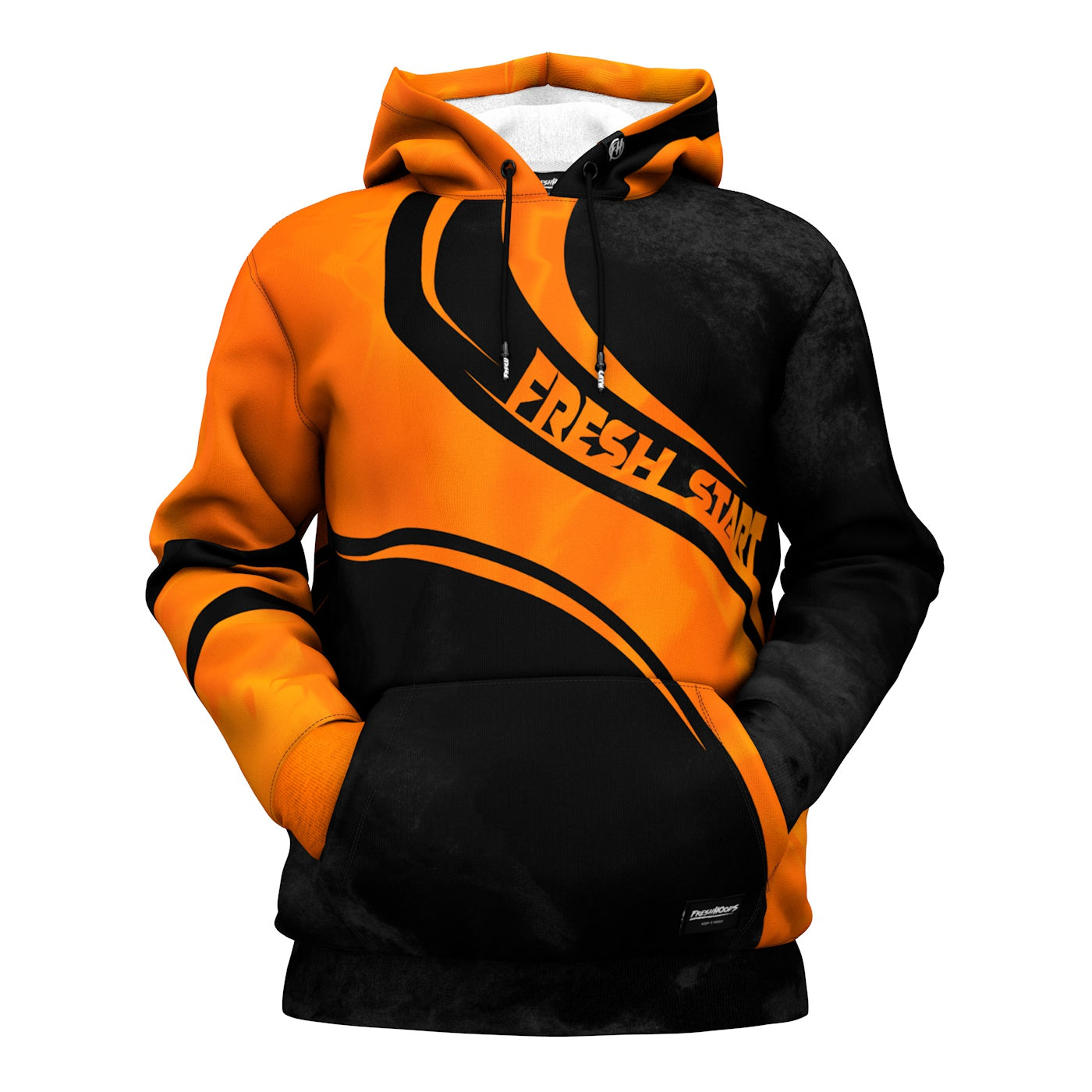 Create a bold and dramatic look by wearing the Fresh Start Hoodie, featuring a custom-made design created from premium polyester. Our resident artists created the orange and black confluence colors for a cohesive look.