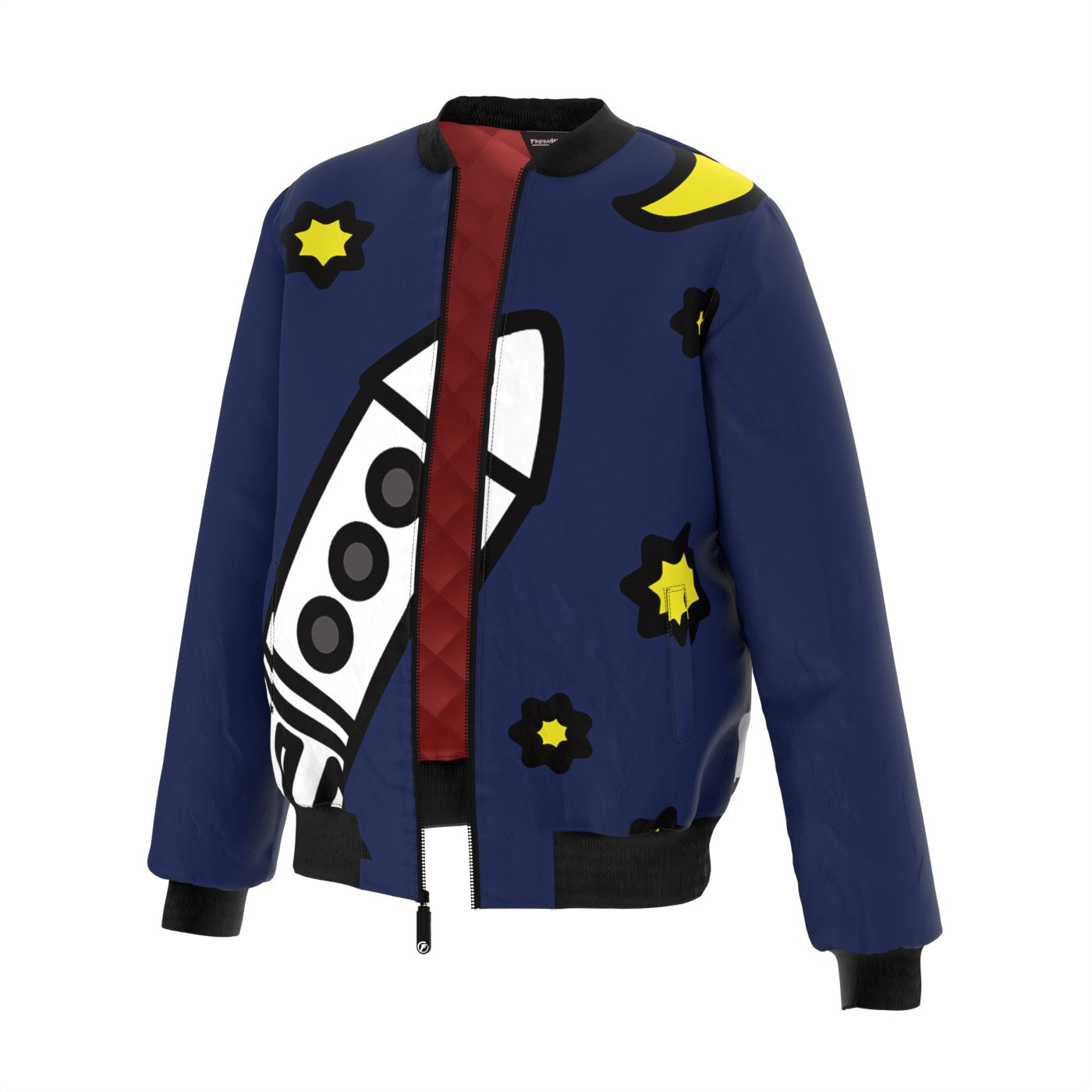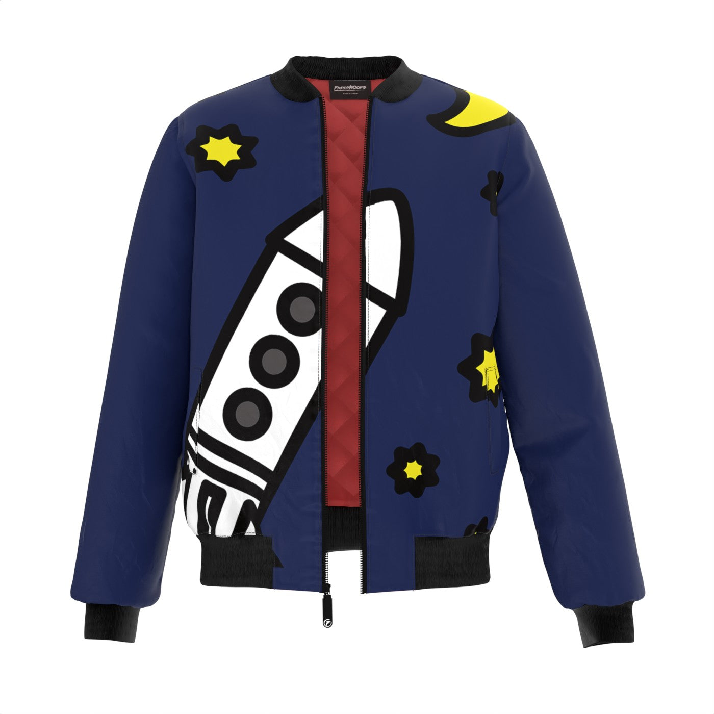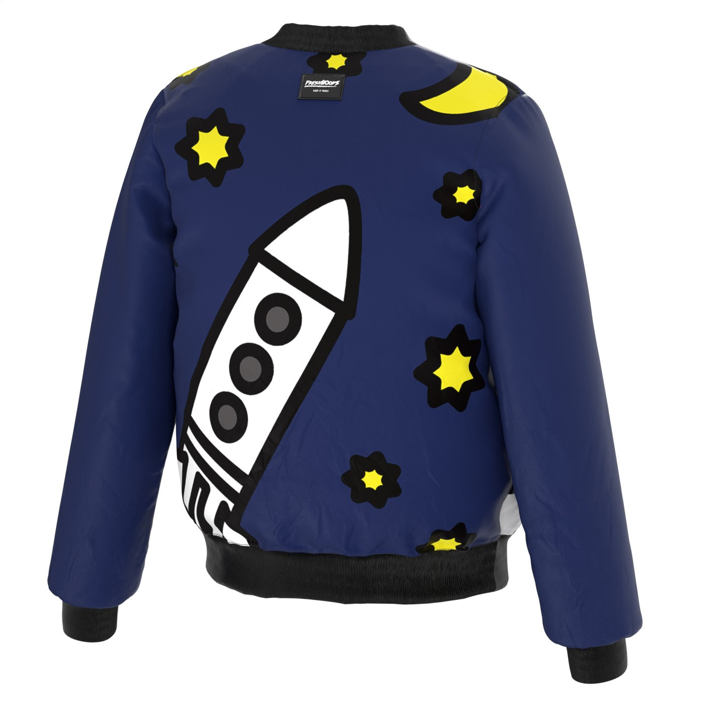 The Lancio Bomber Jacket designed by the talented Pitpop, features a playful space-themed design. With a vibrant rocket soaring among stars on a navy blue background, and a bright yellow hood lining, this jacket is sure to ignite your imagination and sense of adventure.