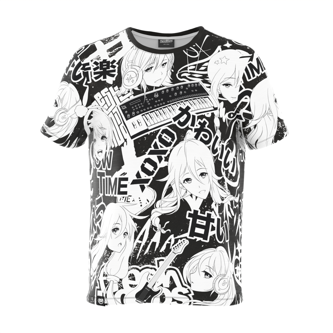 Surrounding the anime girl, a symphony of musical instruments weaves its way through the design. Guitars and keyboards come together in perfect harmony, symbolizing the vast world of music waiting to be explored.