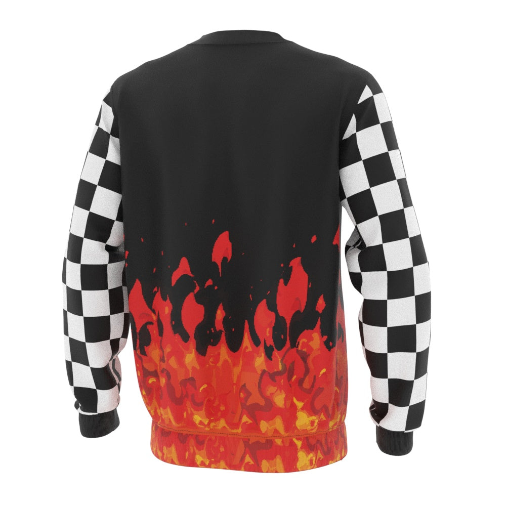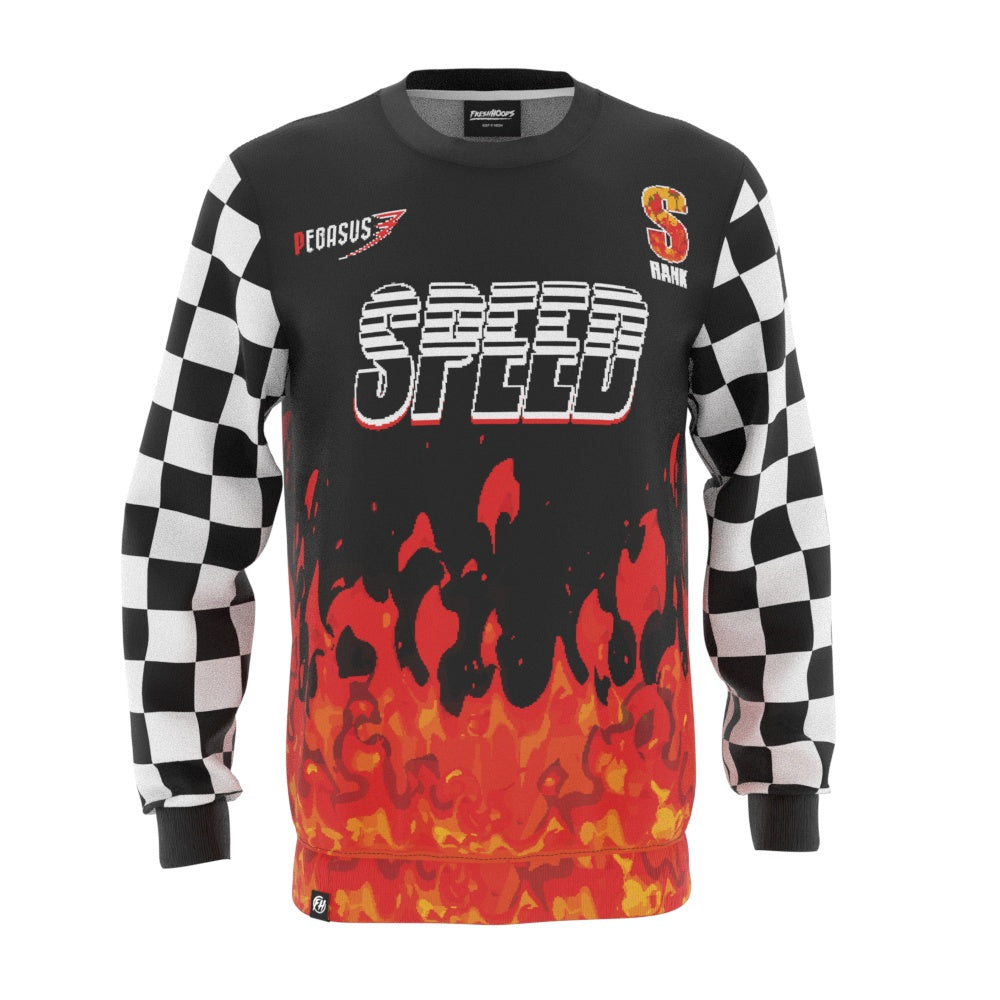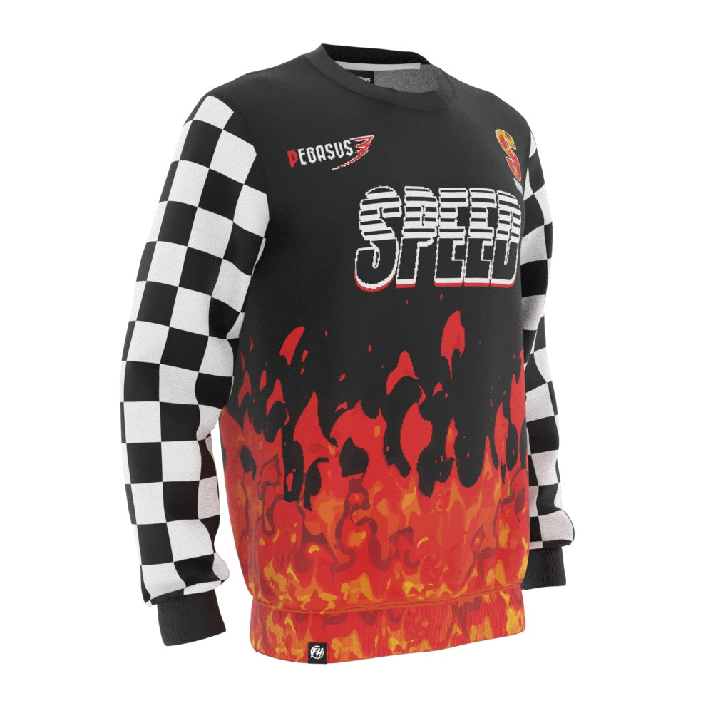 Get ready to blaze past the competition with the Speed Race Sweatshirt, where adrenaline meets style. This sweatshirt is a tribute to the speed demons and race enthusiasts who believe life is best lived in the fast lane. Featuring a dynamic blend of checkered sleeves and a fiery inferno rising from the hem, it's designed to make a statement as bold as the engines it honors. The chest roars with the word "SPEED" in bold, impactful letters, matched by racing patches that set the tone for a high-octane lifestyle. Put it on and feel the thrill of the race, no matter where you are.
