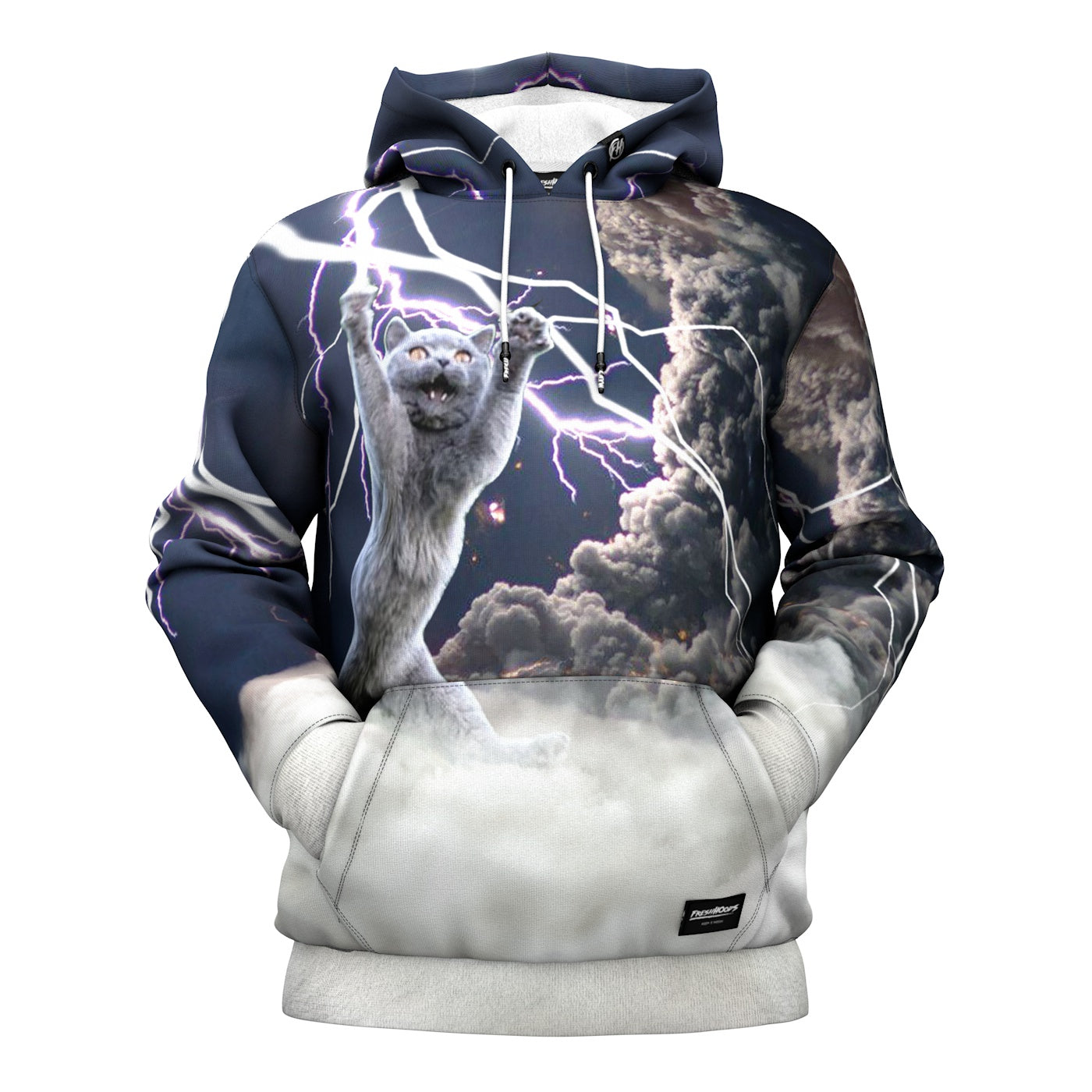 Electrify your looks in an adorable style with the Thunder Cat Hoodie, featuring a custom made design, crafted from 100% polyester. The print showing a realistic kitten in front of thunder was designed by our resident artists.