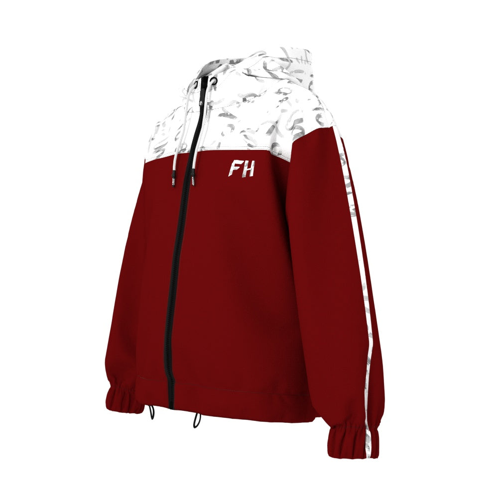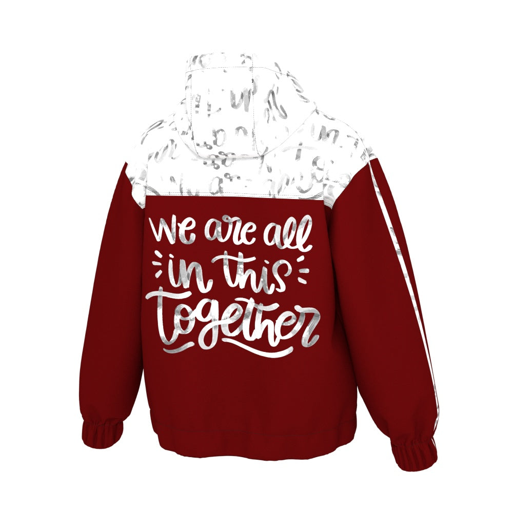 Introducing the Together! Windbreaker – a striking embodiment of unity and camaraderie. With a rich burgundy hue evoking academic pride, this windbreaker features a unique design – the top, hood, and shoulders in crisp white, displaying mixed pale letters.